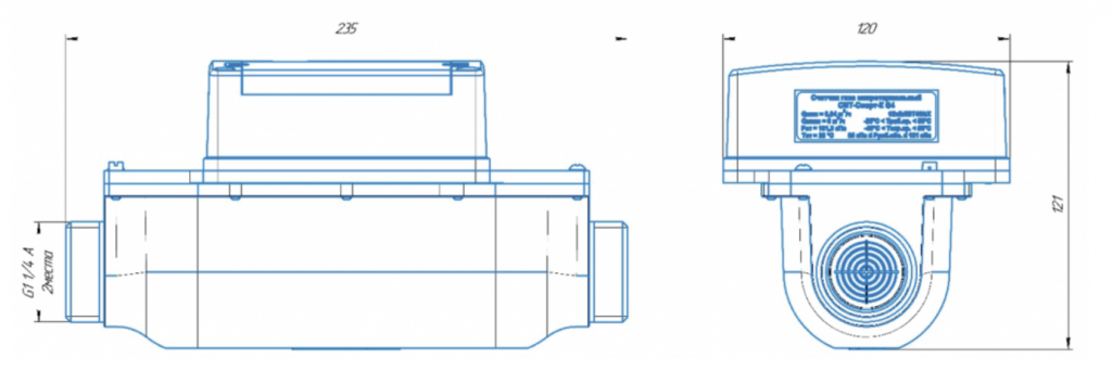 Габаритные и присоединительные размеры счётчика газа с запорным клапаном СМТ-Смарт-К